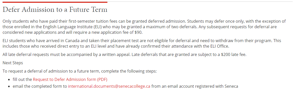 서류 제출 방법: Request to Defer Admission form 서류를 작성하여, PDF 첨부하여 이메일(international.documents@senecacollege.ca) 보내기