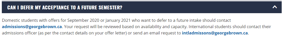 조지 브라운 컬리지(George Brown College)도 입학 연기 방법에 대해 설명해 놓은 페이지는 없었고, 아래와 같이 FAQ 형식으로 아주 간단하게 이메일 보내라고만 적혀있었습니다.