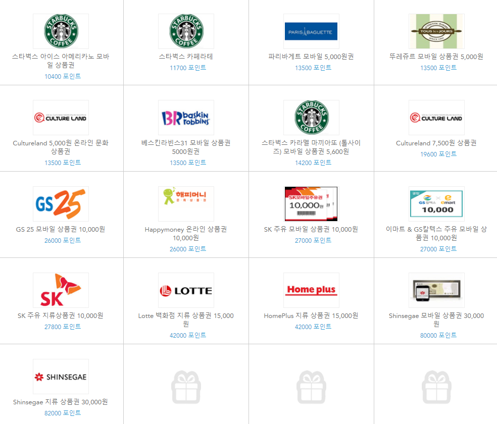 포인트에 따라 리워드 상품으로 교환할 수 있습니다. 제가 사용하는 동안 리워드 상품 품목이나 포인트 가격이 바뀐 적은 없는 것 같습니다.