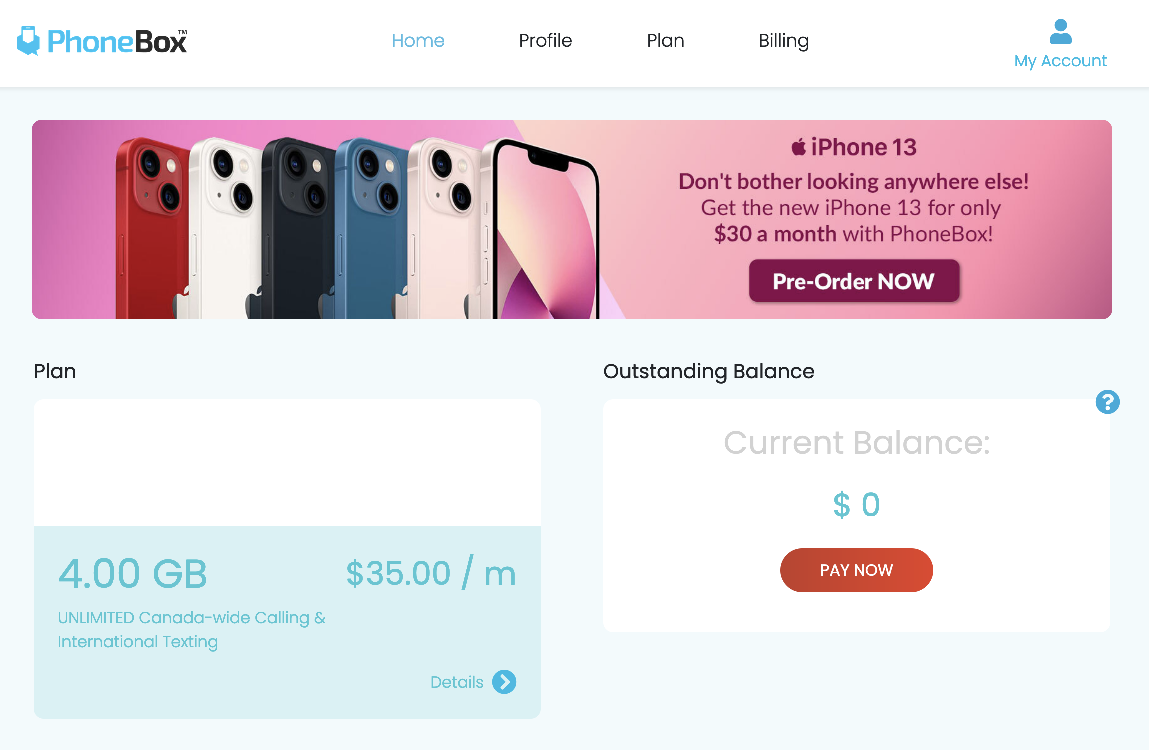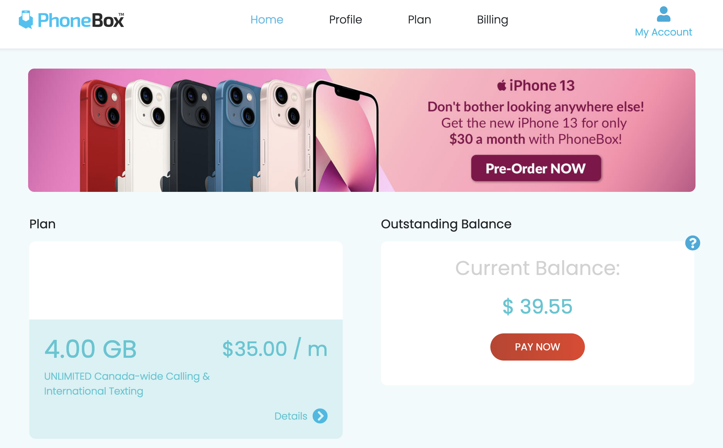 폰박스 홈페이지(www.gophonebox.com)에 접속하고 로그인을 합니다. 로그인을하고 나면 아래와 같은 페이지가 나옵니다. 저는 원래 $45 8G 플랜을 쓰고 있다가 데이터를 생각보다 많이 쓰지 않아서 $35 4G 플랜으로 바꿨습니다. 지금도 큰 불편함없이 사용하고 있습니다. 온라인 수업이 많아 대부분 시간을 집에서 와이파이 사용해서 그런 것 같습니다. $35에 세금(13%)을 합치면 총 $39.55 입니다.