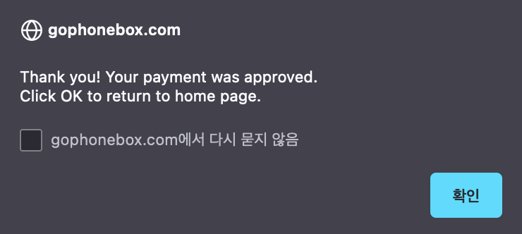 결제하려고 하는 신용카드의 정보를 입력합니다. 성공하면 아래와 같이 승인되었다는 팝업창이 나오고 이메일로 영수증이 발행됩니다.