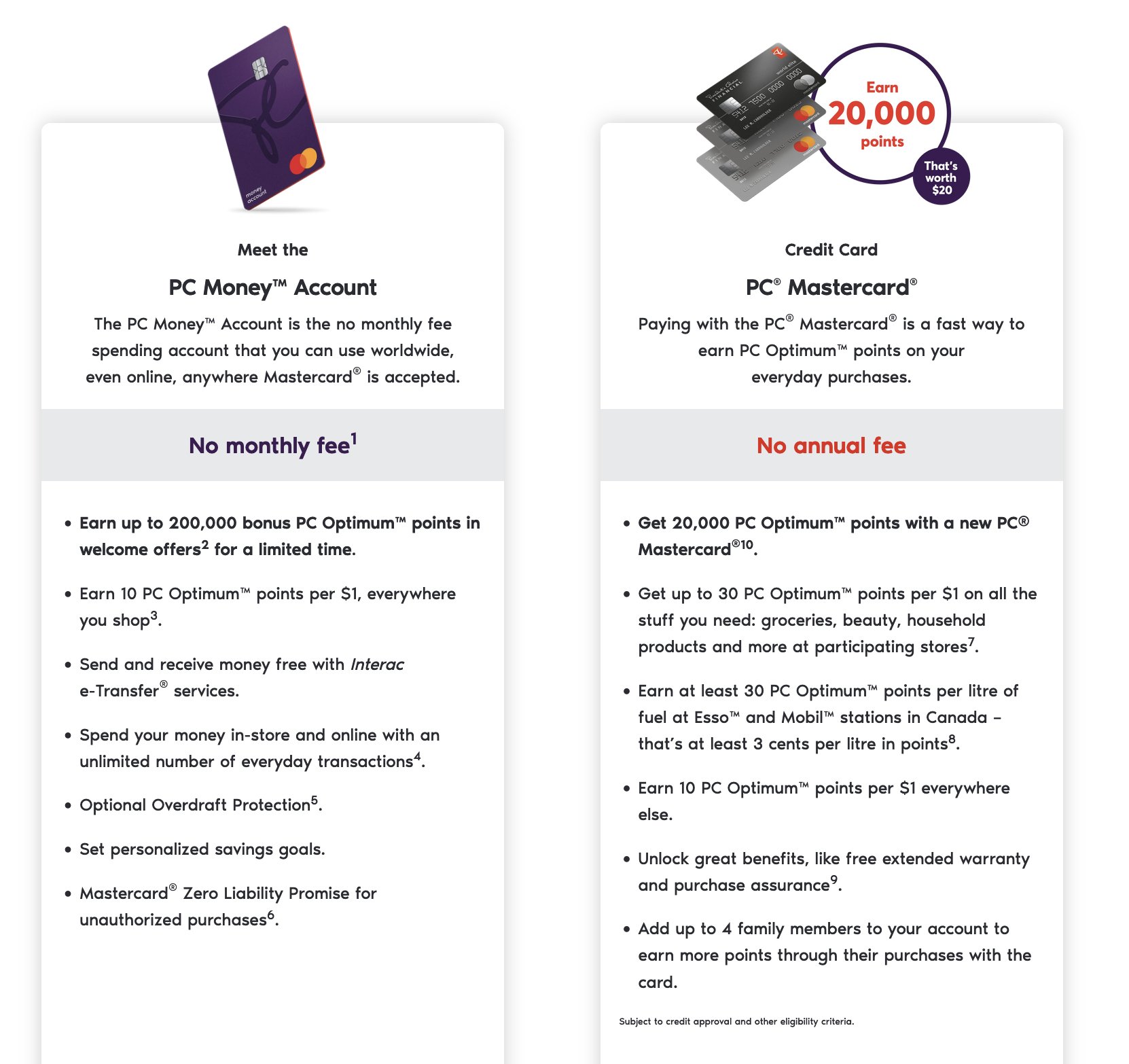 그런데 노프릴에서 장을 보는 횟수가 점점 많아지면서 PC optimum 포인트를 더 빨리 쌓을 수 있는 PC Financial 카드(공식 홈페이지)를 만들어볼까하고 알아보기 시작했습니다. PC Money Account 와 PC Mastercard는 데빗과 크레딧 카드 차이인것 같은데, PC Money Account 데빗카드(체크카드)의 경우에는 큰 조건없이 만들 수 있고 가입 축하 포인트도 20,000점($20)을 준다고 홍보하고 있었습니다. 그리고 $1마다 PC optimum 10포인트를 준다고 하여 나쁘지 않을 것 같아 신청하였습니다.