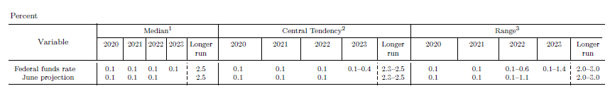 저금리(Federal funds rate, FFR)는 2023년까지 유지될 것으로 예상하고 있습니다. 성명서(Statement) 원문에서는 0~0.25% 금리 유지한다고 나와있지만, 2023년까지 라고는 표현되어 있지는 않습니다. 다만 미래 전망 자료(Projection materials)에서 금리가 2023년까지 0.1%로 나와 있어 그와 같이 기사가 나온 것 같습니다.