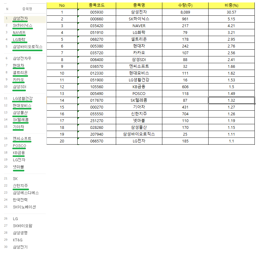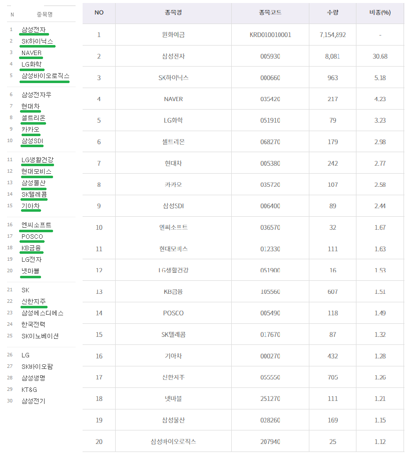 KODEX 200: 비중을 기준으로, 시가총액 순서와 약간은 다르지만 신한지주를 제외한 모든 종목이 시가총액 TOP20에 있었습니다. 총비중은 약 70.3%입니다.