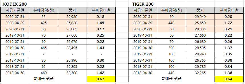 3년간 분배금 비율: KODEX 200 0.67% / TIGER 200 0.64%