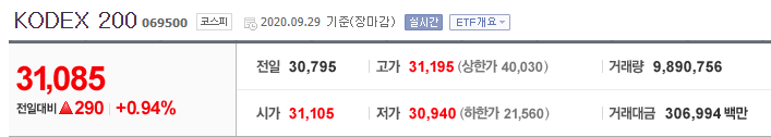 현재가: KODEX 200 31,085원 / TIGER 200 31,030원