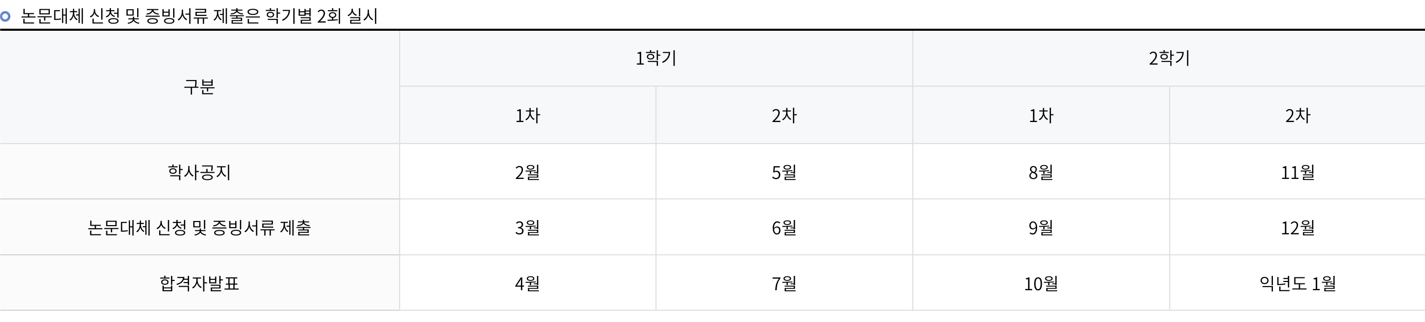 논문 대체 신청은 1년에 총 4번으로, 한 학기당 2번 진행됩니다. 대략적인 날짜는 아래와 같습니다. 시험 일정을 이 이전으로 잡아두면 순조롭게 졸업하실 수 있을 거예요. 정확한 날짜는 학사공지에서 서류 제출기한(1주일)을 알려주는데 이 기간을 잘 메모해 두었다가 기한 내에 서류를 보내면 됩니다.