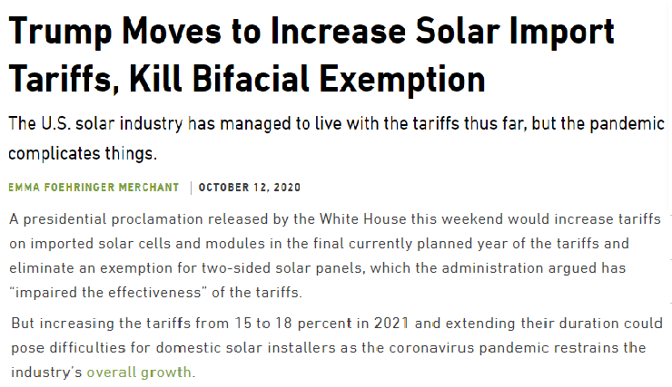 Trump Moves to Increase Solar Import Tariffs, Kill Bifacial Exemption, 2020.10.12., www.greentechmedia.com/articles/read/presidential-proclamation-to-increase-extend-section-201-tariffs