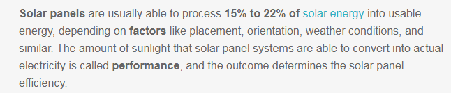 각광받고 있는 태양에너지는 생산성이 좋을까요? 여러 기사를 찾아보니 아직까지는 대략 15~22%의 효율을 보이는 것 같습니다. 아무래도 설치할 수 있는 위치가 제한적이고, 날씨 등의 영향을 받으니 효율이 높지는 않겠다 했지만 제 생각보다 더 낮은 것 같습니다. 주관적인 생각이지만 아직 갈 길이 먼 것 같습니다.
