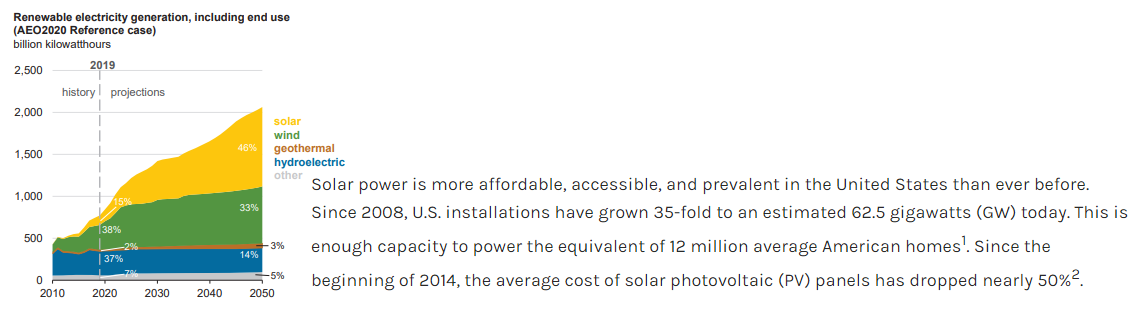 미국 에너지 정보부에서 나온 Annual Energy Outlook 2020에 따르면 태양에너지가 재생에너지 중에 가장 많이 쓰일 것이라고 예상하고 있고, 앞으로 지속적으로 성장할 것으로 예상하고 있습니다. 설치 비용도 계속 떨어지고 있다는 것을 보면 지속적으로 성장하는데 큰 문제는 없어 보입니다.