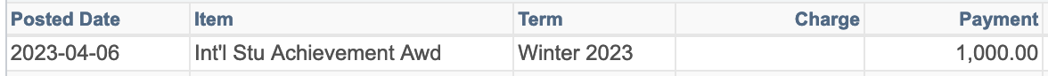 그런데 이번에 장학금을 $1,000 받았네요. 저도 신기하고 놀라서 여러번 확인했습니다. 항목은 International Student Achievement Award이고, 찾아보니 성적이 2.9학점 이상인 풀타임 그리고 리더십과 학교 활동을 하는 국제 학생에게 주는 장학금이라고 합니다. 지금까지 성적이 4.0학점이기는 하지만 성적 기준이 2.9학점인 것을 보아 그것 때문은 아닌 것 같고, 지원서에 이것저것 작은 것이라도 적기는 했는데 무엇으로 선정된 지는 잘 모르겠습니다.