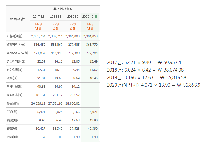 현재 주가 58,800원에서, 2020년도 예상치로 구해보면 4,065(EPS) × 10.44(ROE) = ₩ 42,438.6라서 고평가라고 할 수 있습니다. 하지만 삼성전자의 성장성을 보고 PER 15로 두면, 4,065(EPS) × 15(PER) = ₩ 60,975로 아직 저평가된 것으로 보여집니다.