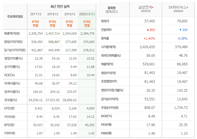 EPS × PER에서 PER를 동종업계의 PER를 고려하여 사용한다 합니다. 예를 들어, 삼성전자를 SK하이닉스만큼의 평가를 받아야 된다고 가정하면, 4,071(삼성전자 예상 EPS) × 25.35(SK하이닉스 PER) = ₩ 103,199.85으로 현재 주가 57,400에 비하면 한참 상승여력이 있다고 볼 수 있습니다.