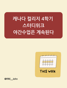 드디어 한 숨 돌릴 수 있는 스터디 위크가 시작되었습니다. 지난주에 중간고사를 봤던 과목은 수업이 없지만, 야간 수업은 정규 수업에 비해 1주 늦게 개강해서 스터디 위크가 없이 진행되기 때문에 야간 수업은 이번주도 있습니다. 그래도 일주일에 2번이나 하는 수업이 없으니 마음이 한결 편했습니다.