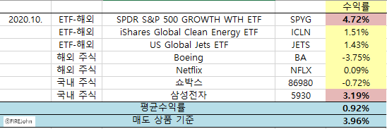 2020년 10월 투자 수익: (매도 상품 기준) + 3.96% / (전체) + 0.92%