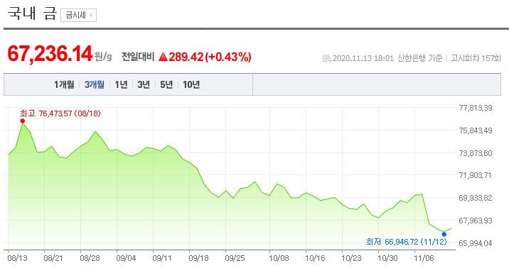 한동안 7만 원대였는데, 코로나19가 어느 정도 진정되었다는 전망 때문이었는지 8월부터 지속적으로 하락하고 있습니다. 제가 글을 쓰고 있는 지금은 67,236.14원입니다.