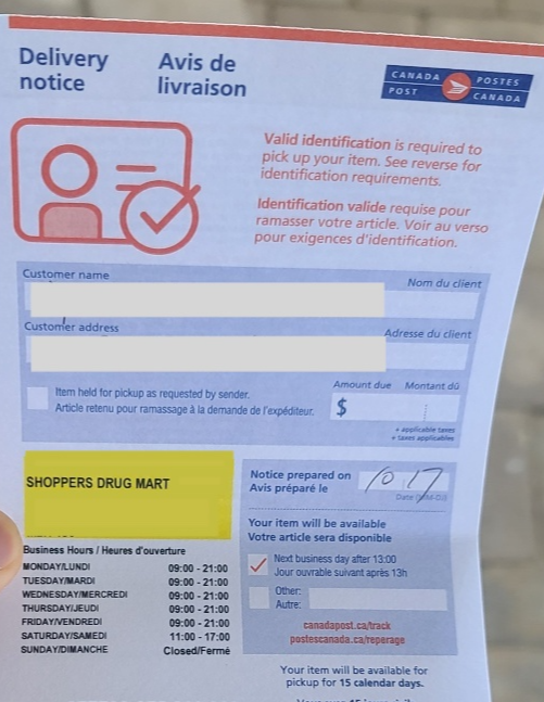 콘도라면 카운터에서 받아주지만, 하우스의 경우 택배는 사람이 집에 없으면 아래와 같이 주변 캐나다 포스트 지점에서 찾아가라는 노티스(Delivery Notice)를 우체통에 넣어둡니다. 이 노티스에 찾아갈 곳의 주소가 적혀있는데 저는 집주변 캐나다 포스트가 샤퍼스안에 있어 샤퍼스가 적혀있었습니다. 다음날 오후 1시 이후에 찾아가라고 적혀있지만 캐나다 포스트 배송 조회해보니 이미 샤퍼스에 맡겨져 있다고 해서 퇴근하고 바로 찾으러 갔습니다.