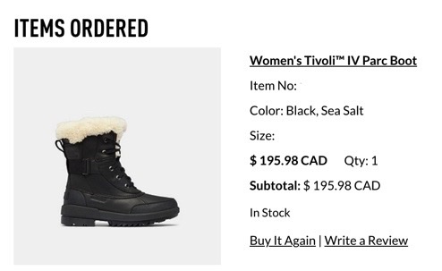 저는 한국에서 부츠를 사올까하다가 부피도 크고 캐나다 추위는 캐나다 부츠로 사야된다고 생각해서 그냥 왔습니다. 이것 저것 알아보던 중 소렐(SOREL) Tivoli IV Parc Boot를 보는 순간 너무 마음에 들어서 바로 샀습니다. 12월 마지막날 산 것을 봐서 박싱 데이 세일 받은 것 같습니다. 상품 가격은 $195.98이지만 배달, 세금까지 포함하여 $229.37을 냈습니다. 저는 2년전에 샀는데 지금은 소렐 홈페이지를 기준으로 $199.91로 가격이 조금 올랐네요.
