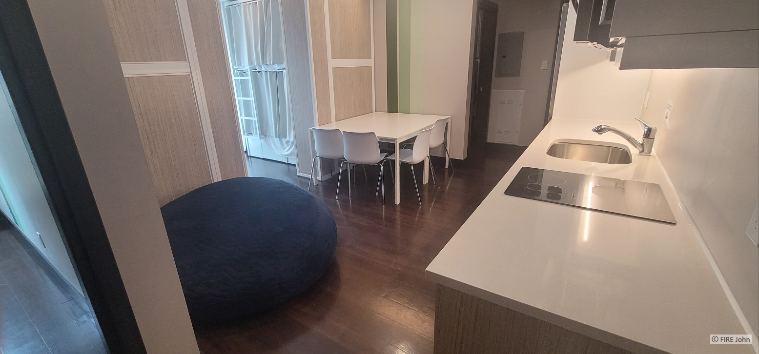방안에 사진과 같이 큰 책상과 의자, 전신거울이 있었습니다. 책상에서 이따금씩 노트북하시는 분들도 있었습니다. 전신거울은 제가 서있는 곳에 옆에 있는데 사진에는 담기지 않았네요. 냉장고, 전자렌지, 인덕션도 있는데 주방 도구가 갖추어 있지는 않은 것 같았습니다. 가끔 전자렌지 사용하는 사람은 있었습니다. 전체적으로 조용히 하는 분위기였고 짐을 옮기거나 낮 시간에 작게 이야기하는 것 이외에는 큰 소음 없이 잘 지냈습니다.