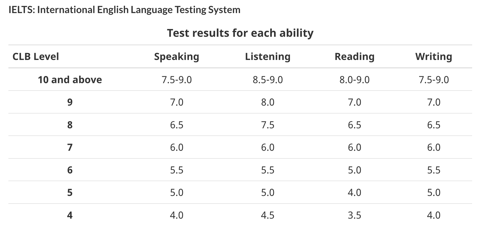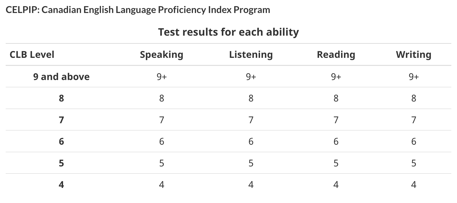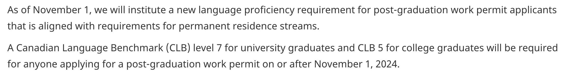 원래 PGWP를 신청할 때에는 영어 성적이 필요하지 않았습니다. 졸업 증명서, 공식 성적표, 이민성 신청 폼 정도만 제출하면 되었습니다. 하지만 11월 1일부터 PGWP를 신청할 때 공식 영어/불어 성적이 필요합니다. 대학인 경우 CLB7, 컬리지의 경우 CLB5이상을 받아야 합니다.(아래 차트 참고바랍니다) 레벨로 보면 크게 어려운 정도는 아니지만 이번 12월에 졸업하는 경우 많은 학생의 접수가 예상되니 얼른 시험 신청해야 합니다. 참고로, 셀핍(CELPIP) 시험료가 10월 1일부터 $10 오를 예정이라 국제학생들에게 더 부담이 가중될 예정입니다.