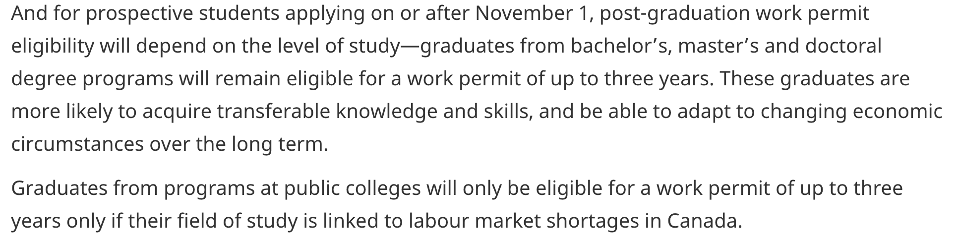 지금까지는 2년동안 DLI가 있는 학교에서 공부하면 최대 3년까지 PGWP를 받을 수 있었습니다. 모두 풀타임으로 공부해야 하는 조건이 있기는 하지만 대부분 어렵지 않게 3년을 받을 수 있었습니다. 하지만 이제는 학사, 석사, 박사는 3년을 받을 수 있지만 컬리지는 노동력 부족 분야와 연관된 학생들만 3년을 받을 수 있다고 합니다. 즉, 이 분야에 속해 있지 않으면 3년보다 적은 기간을 받을 수 있습니다. 아직 노동력 부족 분야가 아직 나오지 않아서 조금 기다려봐야 합니다.
