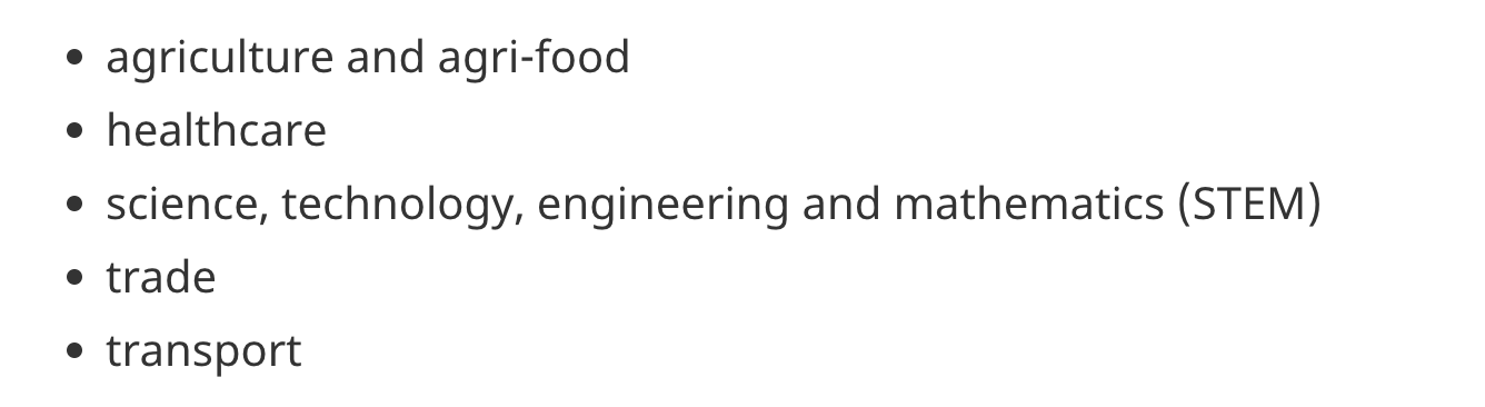 제가 생각하기에 가장 중요한 부분은 PGWP를 주는 전공을 제한한 것입니다. 컬리지 학생 혹은 학사, 석사, 박사 프로그램 외 다른 프로그램을 하는 학생 중 11월 1일이후 스터디 퍼밋을 접수하는 사람은 아래와 같이 농업, 헬스케어, STEM, Trade, 교통 관련 전공만 PGWP를 신청할 수 있다고 합니다. 따라서 한국인이 많이 지원하는 유아교육(Early Childhool Education, ECE)이나 비즈니스 계열 전공은 제외되었습니다.