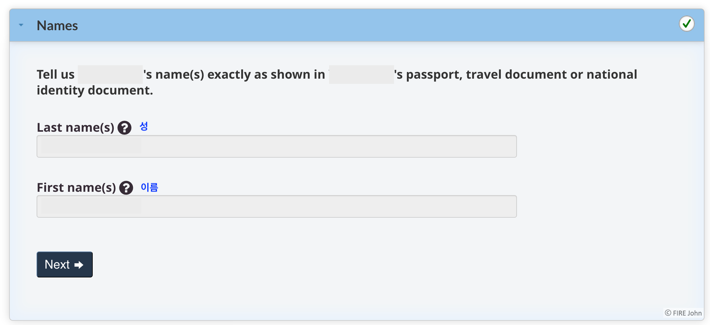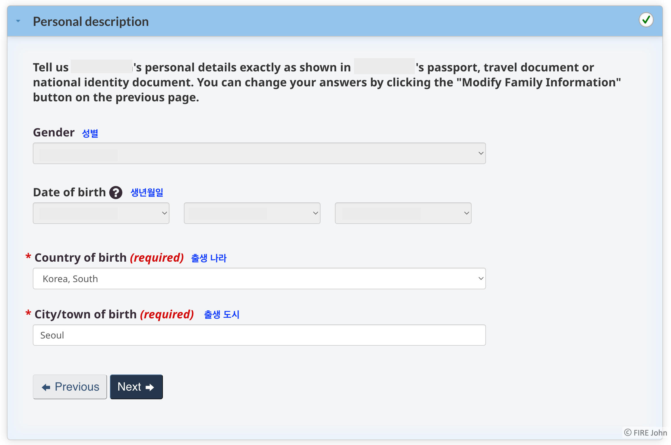 처음으로 개인 정보를 입력하도록 여러 질문들을 합니다. 본인에 대해 물어보는 것이라 크게 어려운 점은 없는 것 같습니다. 회색으로 되어 있는 일부 항목은 저희가 입력할 필요 없이 이미 입력되어 나오니, 이 정보가 맞는지 한 번씩 확인해주시면 됩니다. 이 개인 정보는 여권이랑 동일하게 입력하시면 됩니다.