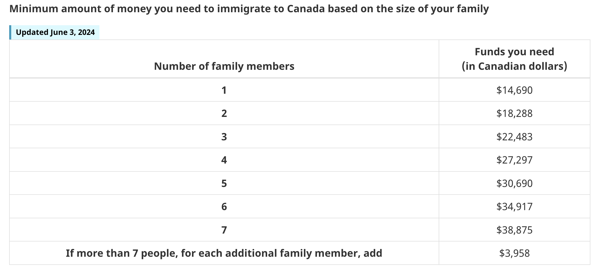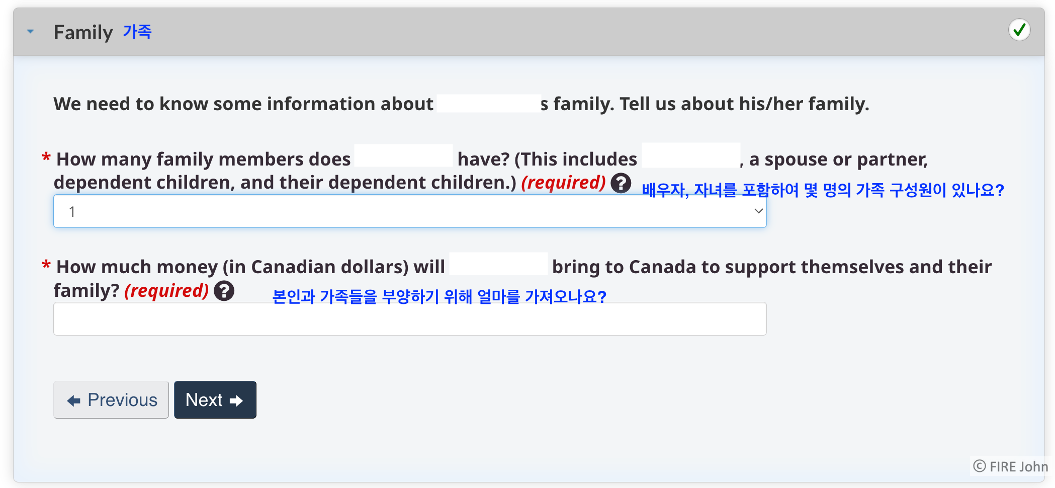 가족에 대한 질문으로 넘어가는데, 총 가족 구성원을 묻습니다. 저는 혼자 이민을 하는 것이라 1로 적었지만 상황에 맞게 입력하시면 됩니다. 또, 부양하기 위한 자금은 기준이 인원에 따라 기준이 다릅니다. 최근 업데이트한 것에 따르면 1명은 CAD 14,690, 3명은 CAD 22,483이 최소 금액이라 합니다. 사진에 링크를 걸어두었으니 자세한 내용은 홈페이지로 이동하여 참고부탁드립니다.