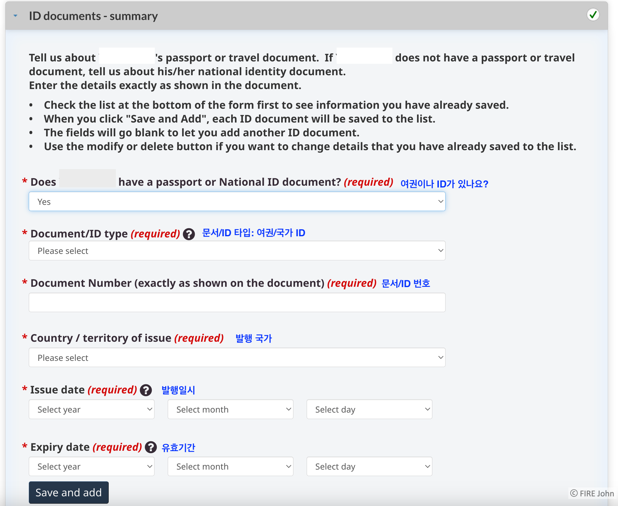 ID 문서에 대한 질문이 있는데 여권이나 국가 ID(한국으로 생각하면 주민등록증인 것 같습니다.)를 넣을 수 있는데 저는 여권 정보를 기준으로 입력하였습니다. 한 가지가 아닌 여러 개도 입력가능합니다.