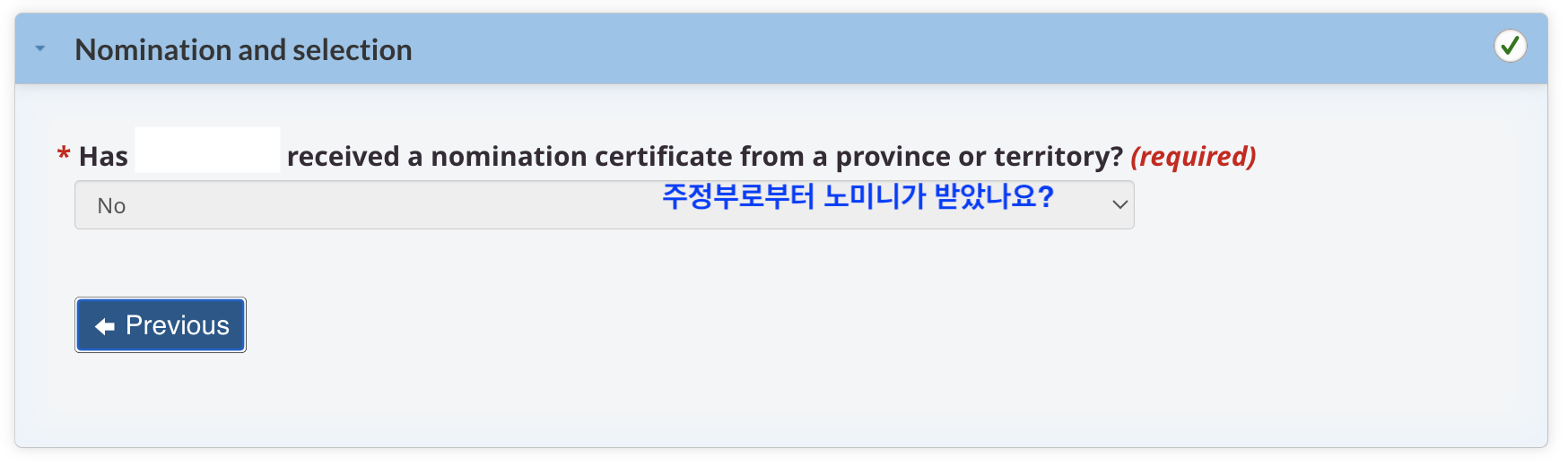 PNP관련 질문입니다. 앞으로 거주할 주와 주정부 이민프로그램에 참여할지 물어보아서 저는 어디든 빨리 되면 좋다는 생각으로 "Yes"로 답했습니다.
