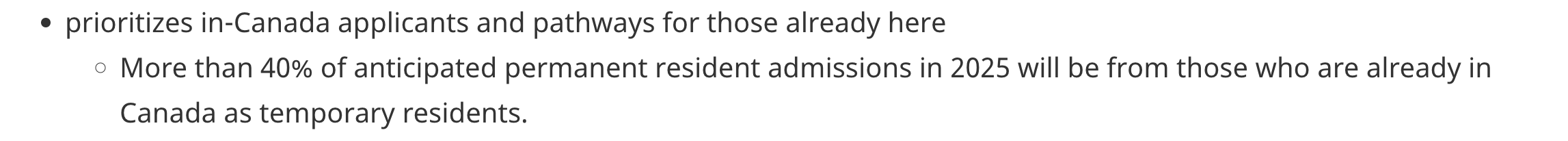 전체적인 이민자 수용 인원이 축소되었습니다. 이전의 약 50만명에서 2025년부터 2027년까지 조금씩 축소하여 36만명대로 가는 것 같습니다. 이에 따라 PNP선발 인원도 줄어들 예정입니다. 이곳 저곳에서 하는 이야기를 들어보니 내년에 정권이 교체되면 또 변할 수도 있어서 우선 2025년에 대한 계획만 주의깊게 보면 된다고 합니다.
