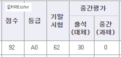 시험은 객관식이어서 점수에 따라 성적이 정해져 있지만, 과제의 경우 대부분 주관식이라 성적이 잘 나오는 편입니다. 부족하더라도 포기하지 말고 조금이라도 해서 제출하면 기본 점수가 있는지 꽤 높은 성적을 받을 수 있습니다. 만약 장학금을 받고 싶다면 열심히 해서 만점(4.5) 받아야 해서 조금 힘들지만, 좋은 성적 내기는 어렵지 않은 것 같습니다. 코로나 19로 모든 시험이 과제로 대체되어서 저는 나름 학점이 높은 편입니다.