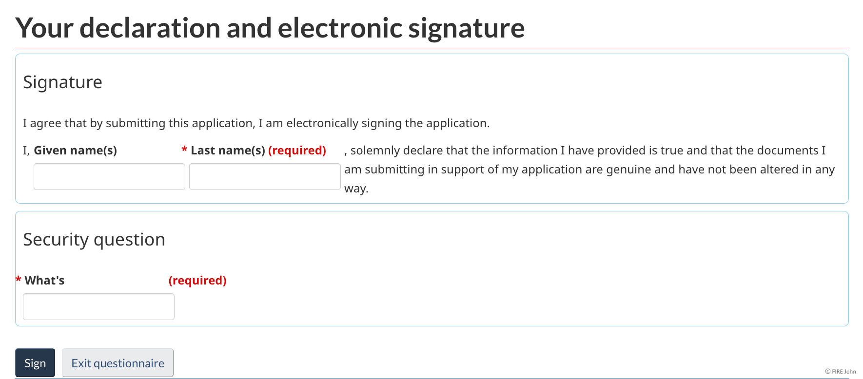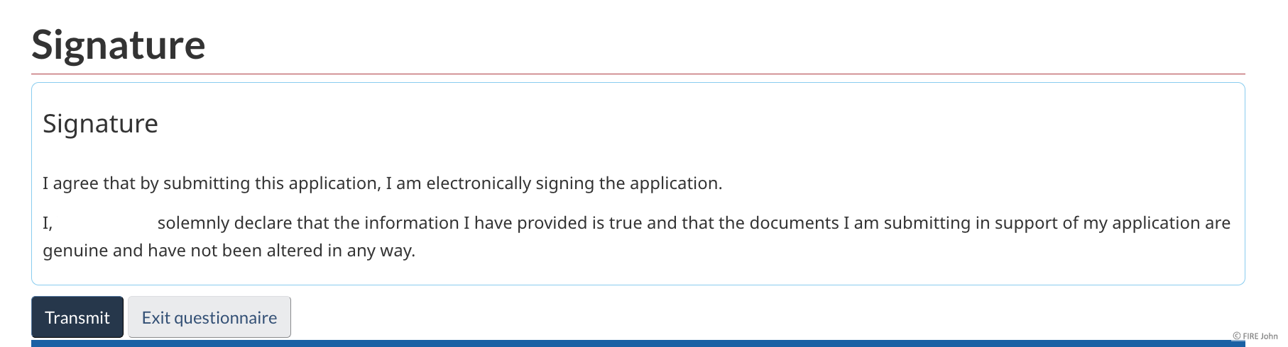 모든 폼을 작성하고 나면 아래 부분에 있는 "Continue" 버튼을 눌러 다음 단계를 진행합니다. "Save and exit"은 말그대로 제출하지 않고 저장하는 것이라 "Continue"를 눌러야 합니다. 그러면 전자 서명 페이지로 넘어갑니다. 작성한 정보가 모두 진실된 내용이라는 것에 대한 동의입니다. 성과 이름을 타이핑하고 보안 질문에 답변을 하고 "Sign"하면 됩니다. 동의했다는 것을 확인하고 "Transmit"까지 눌러줍니다.