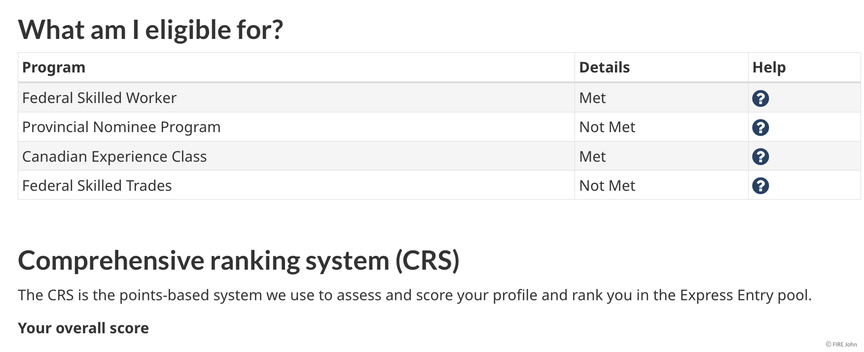 그 밑으로 조금 더 내려가면 스트림 유형 조건에 충족하는지 아닌지 알 수 있고 점수도 바로 계산되어 나옵니다. 저는 한국에서 했던 일이 인정이 되어 Federal Skilled Worker도 가능하고 캐나다에서 1년의 경력이 있어 Canadian Experience Class도 가능합니다. 스트림을 확인하고 자신의 CRS 스코어가 예상했던 점수와 같은지 확인합니다. 만약 다른 점이 있다면 다시 위로 올라가 제출한 지원서를 살펴보고 업데이트합니다.