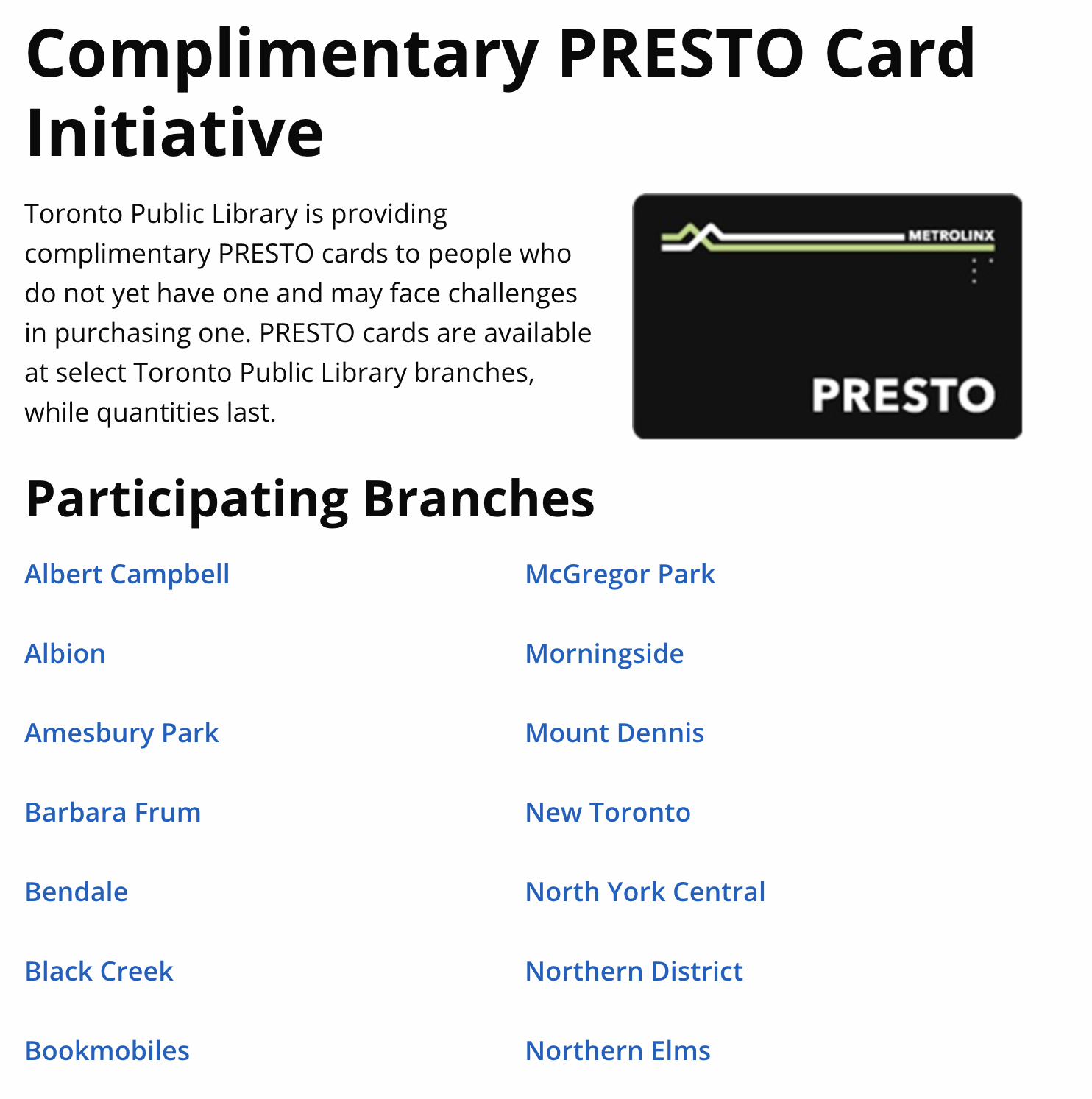 신용카드를 교통카드로 사용할까 하다가 신용카드 분실하면 더 복잡해질 것 같아서 프레스토 카드를 다시 하나를 하나 마련하기로 했습니다. 토론토 도서관에서 무료로 받을 수 있다는 것을 알고 있었거든요. 모든 지점에서 주는 것은 아니고 일부 지점만 하고 있습니다. 사진을 클릭하시면 참여하는 모든 지점을 볼 수 있습니다.