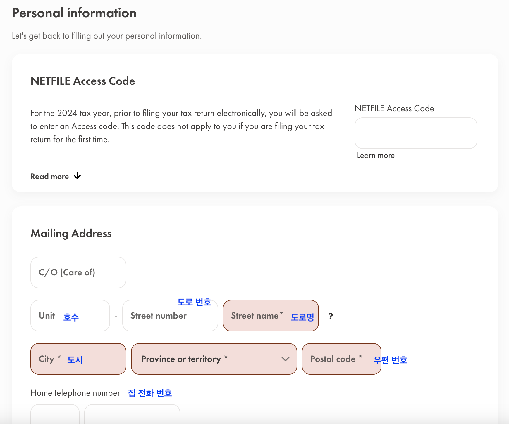 2024년도 NETFILE 접근 코드가 나오는데 따로 적어둡니다. 다시 한번 우편 주소를 기재합니다. 우편을 받을 수 있는 주소를 기재해야 하고 집 전화 번호는 필수 사항 아니라서 집 전화가 없는 저는 비워두었습니다.