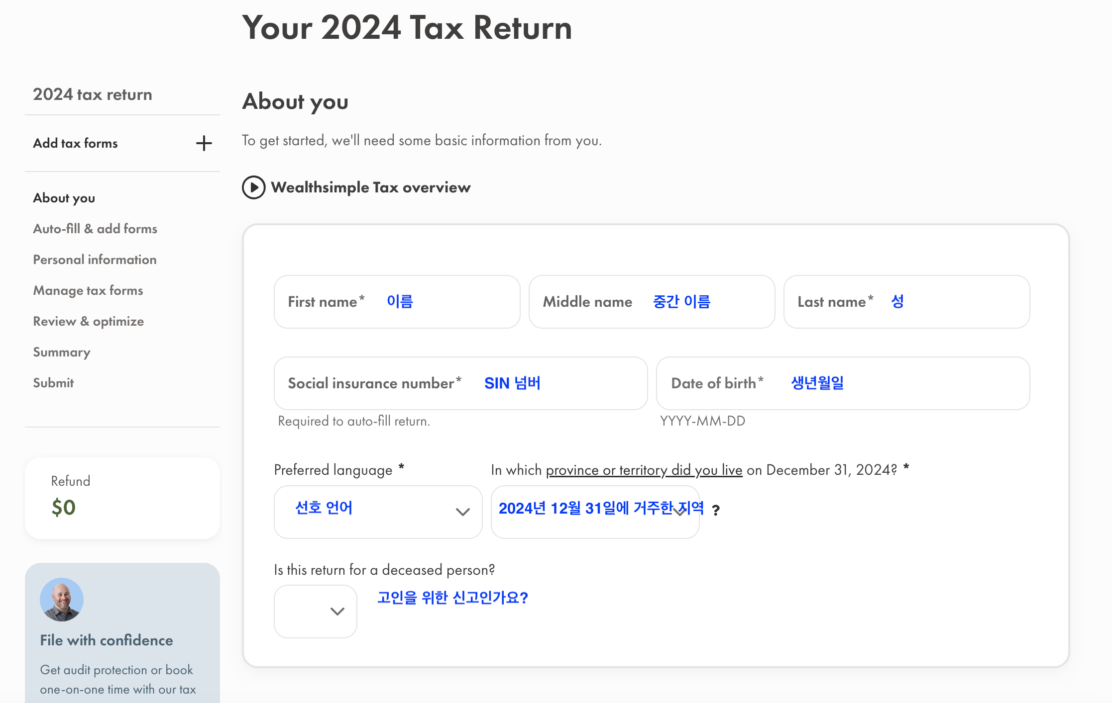 플랜을 선택하고 나면 본격적으로 텍스 신청 약식이 나옵니다. 아래와 같이 개인 정보를 입력하게 됩니다. 이름, SIN넘버, 생일, 언어 등입니다. 왼쪽에 받게 되는 세금 환급 금액(Refund)을 실시간으로 계산되어 보여줍니다.