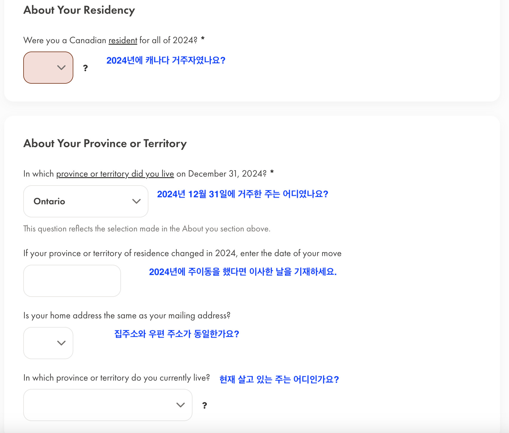 거주지에 대한 정보도 물어봅니다. 2024년에 살았던 것을 기준으로 입력하면 됩니다. 저는 필수로 기재해야 하는 항목(*)만 적었습니다.