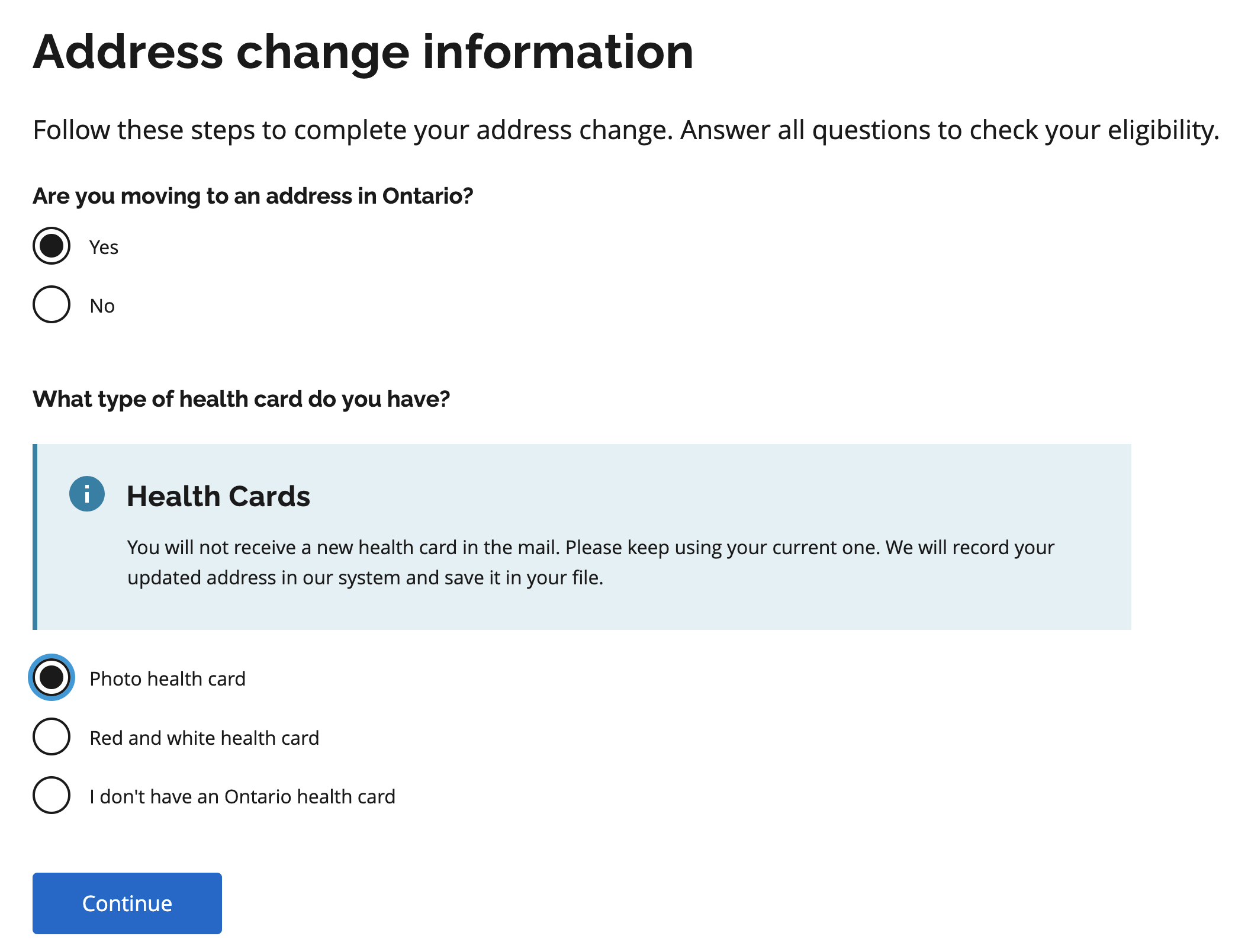 온타리오로 주소를 옮기고 싶다는 물음에 "Yes"표시를 하고, 가지고 있는 헬스카드 종류로 "Photo health card"를 선택합니다. 나머지 Red and white health card나 헬스카드가 없다고 체크하면 에러 화면이 나오면서 서비스 온타리오로 방문하라고 합니다.