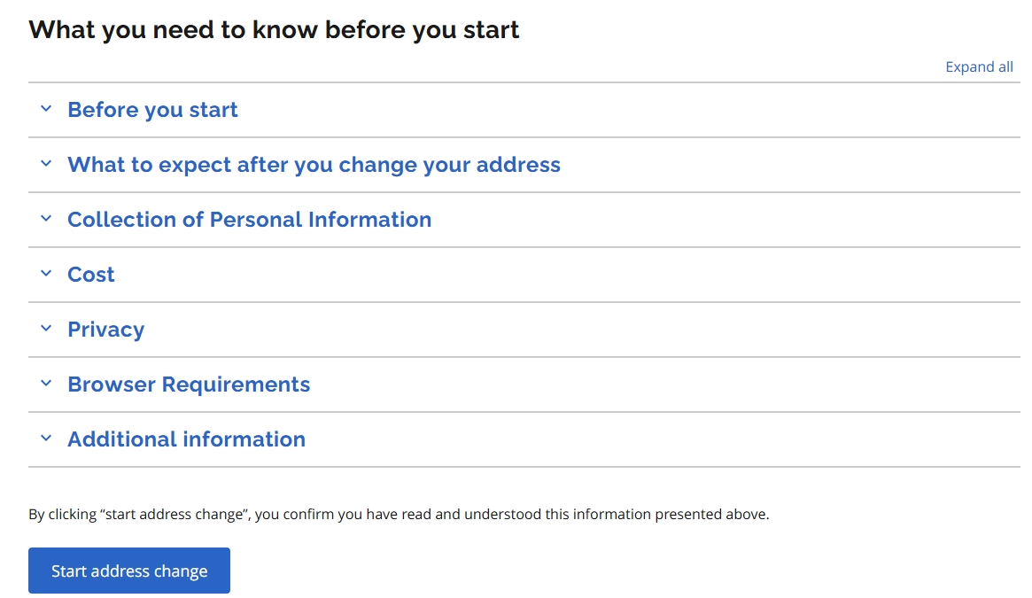 프로세스에 대한 설명이 나와있는데 중요한 부분은 헬스카드가 있어야 하고 헬스카드에 주소가 기재가 되어 있지 않으면 별도로 새 카드가 발급되지 않으며, 운전면허증은 카드를 새로 발급하여 우편으로 보낸다는 이야기입니다. 비용은 무료입니다. 맨 아래 "Start address change"를 누릅니다.