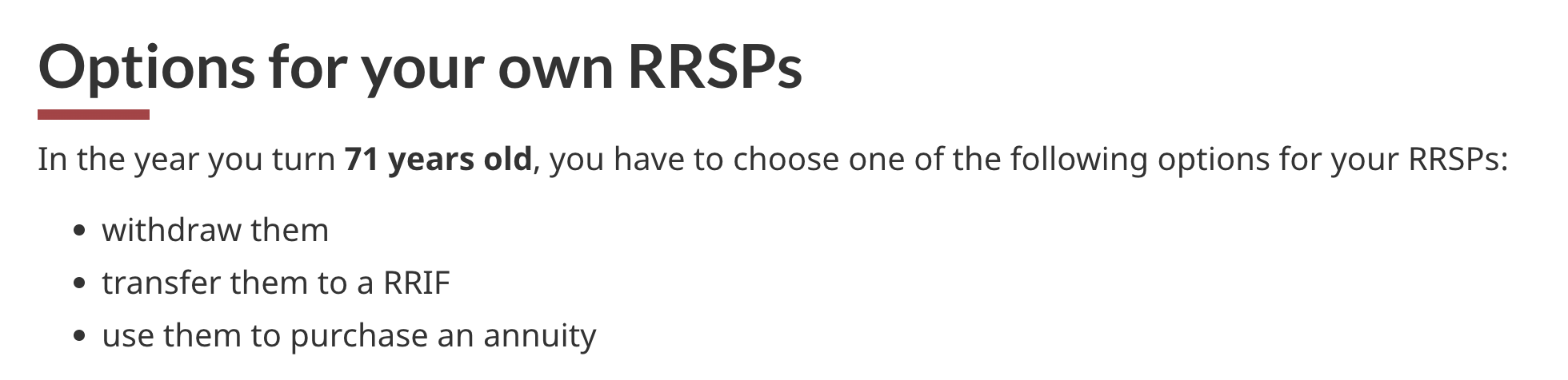 기본적으로는 71세가 되는 12월에 인출하는 것이지만 첫 집을 사는 것(HBP, Home Buyers Plan)과 같은 특정 경우에는 인출이 가능합니다. 71세가 되어 인출할 때에는 한 번에 인출할 수도 있고 RRIF(Registered Retirement Income Fund)라고 해서 은RRSP에서 매년 조금씩 꺼내 쓸 수 있는 펀드로 옮겨서 사용할 수도 있습니다. 마지막으로 보험 회사를 통해 매달 일정 금액을 연금으로 받을 수도 있습니다.
