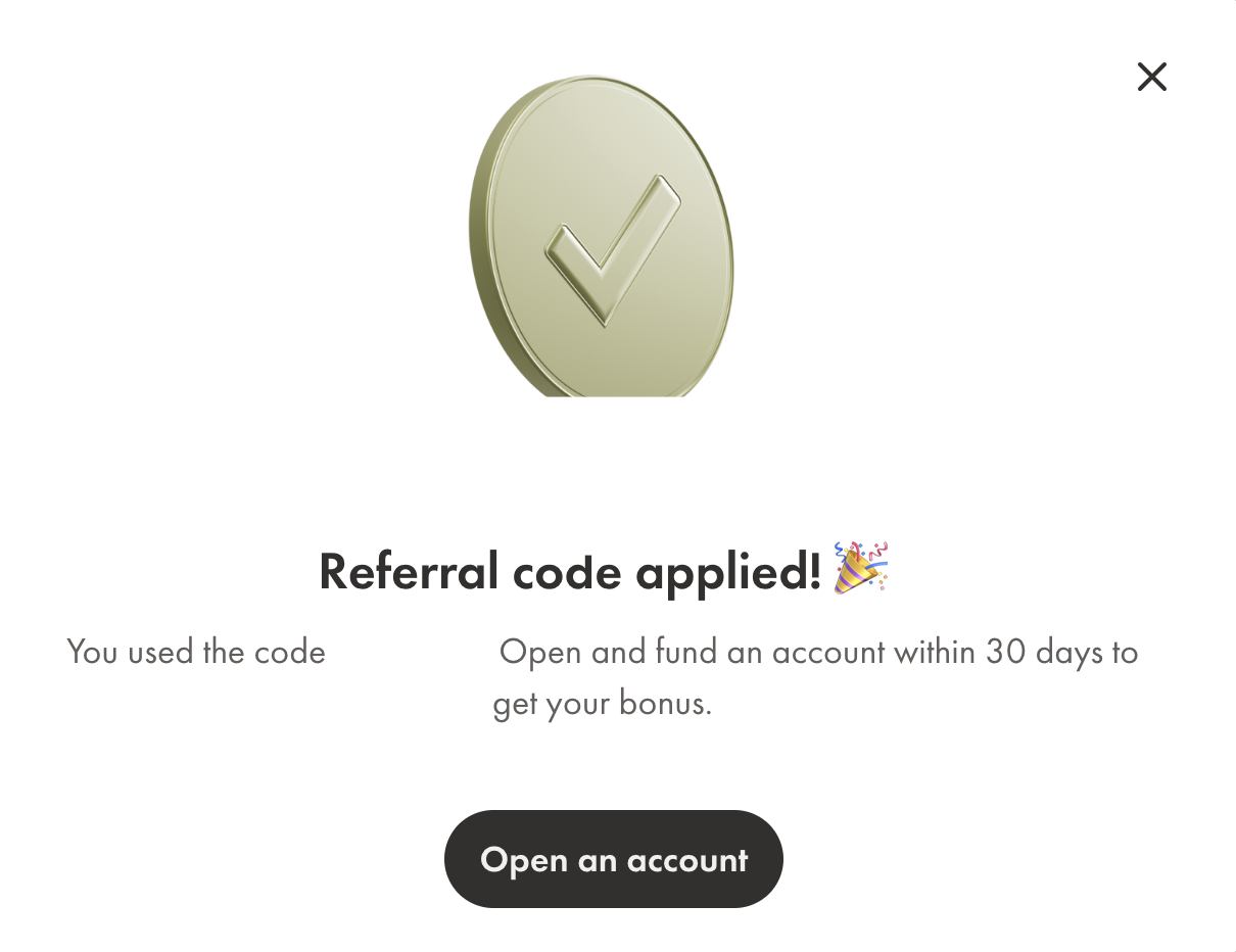 결과적으로 말하면 프로모션 코드 적용되었습니다. 계좌를 오픈한 내역이 없어서 그런 것 같더라고요. 로그인 후 오른쪽 위에 선물 아이콘을 누르면 다른 페이지로 연결되는데 아래 "See referral history" 부분에 "Got referral code?" 라고 나옵니다. 팝업창에 코드를 넣으면 적용되었으니 30일 안에 계좌를 열고 돈을 넣으라고 나옵니다. 아래 왼쪽 화면은 제가 이미 적용한 다음 캡처해서 그렇습니다.