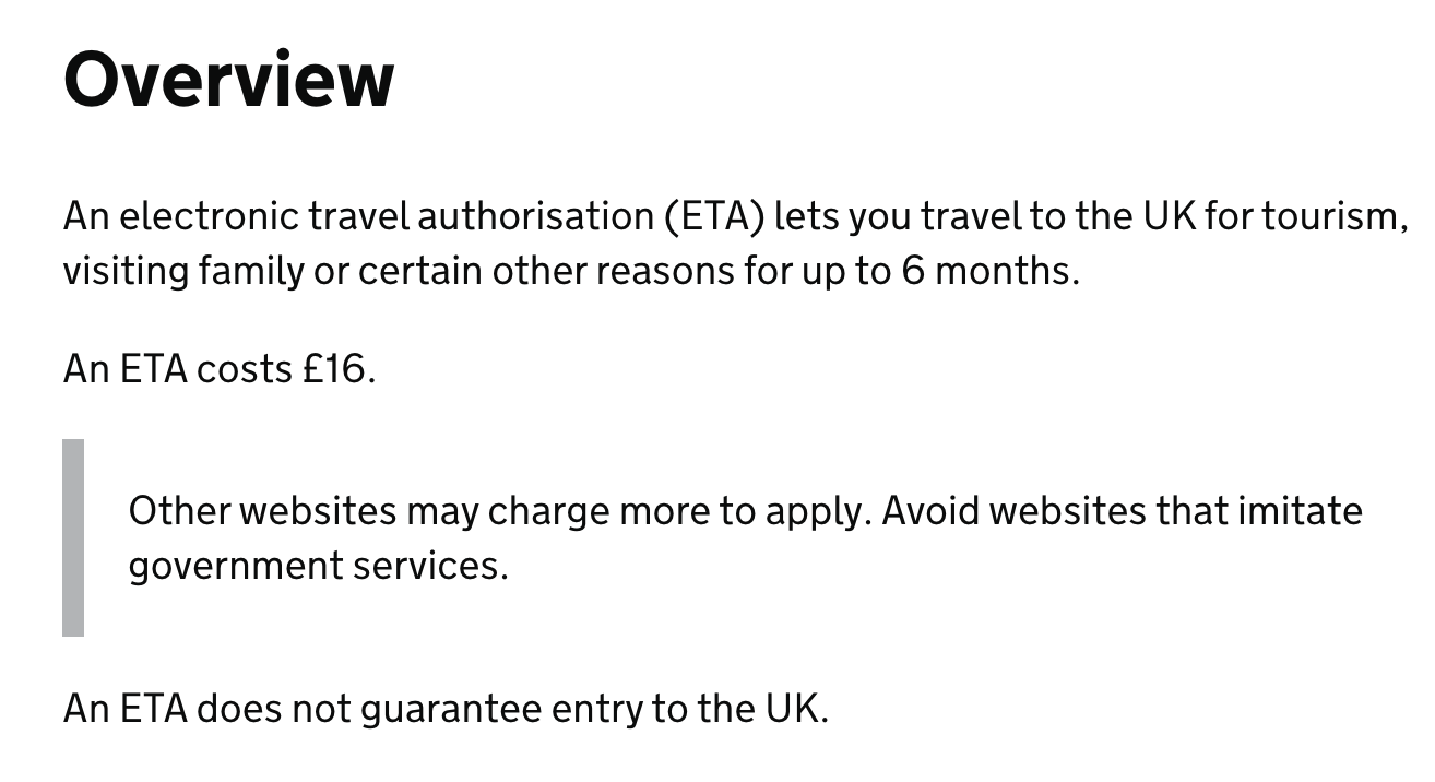 영국에 놀러 갈 계획이 있어 영국 여행 비자을 알아보고 있습니다. 관광은 무비자로 입국 가능한 줄 알았는데 올해부터는 ETA (Electronic Travel authorization)를 받아야 하더라고요. 이 서류가 영국에 입국할 수 있다는 확정 서류가 아니라 입국을 위한 준비 서류이고 입국 심사에서 거절될 수도 있다고 합니다.