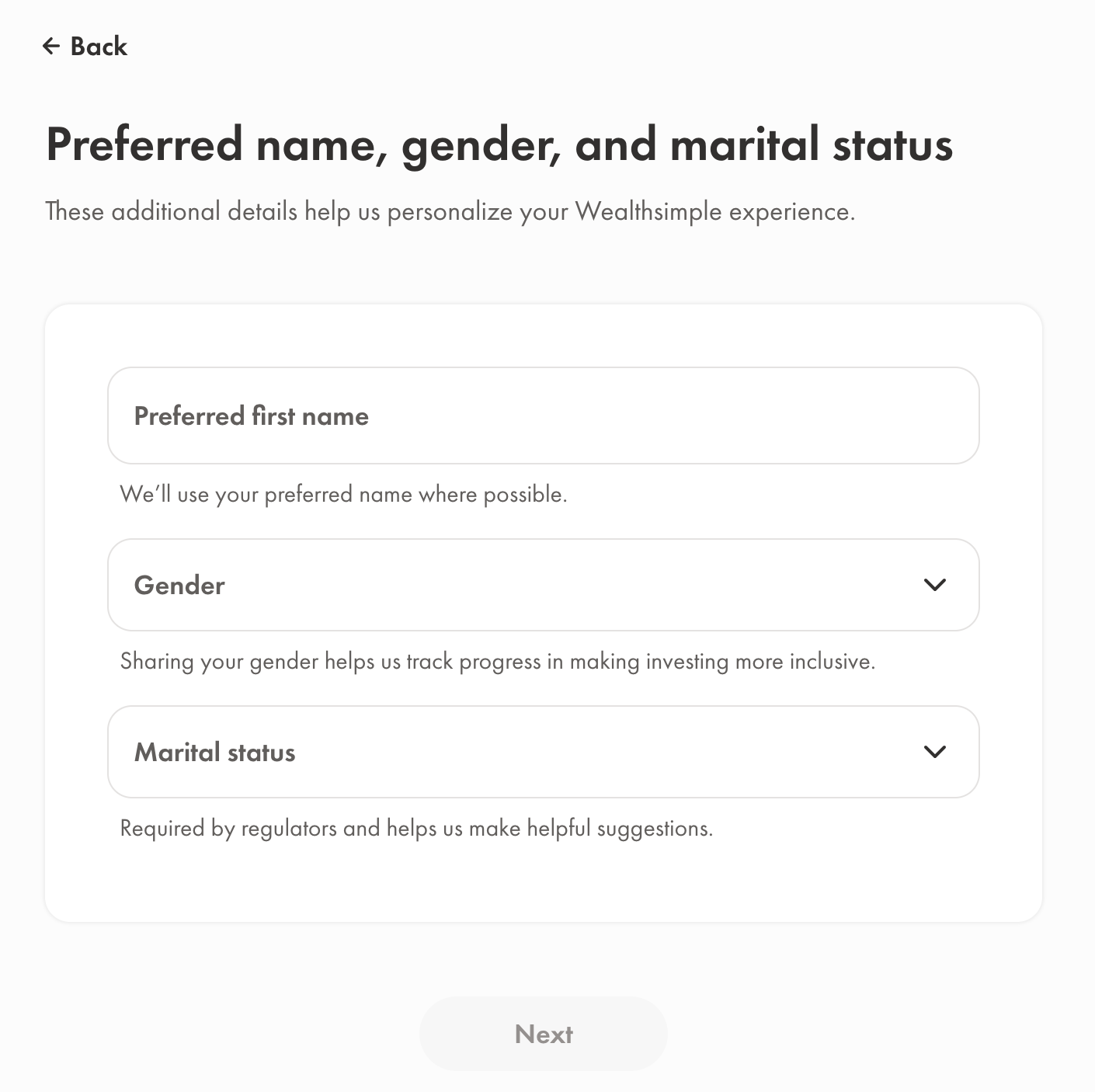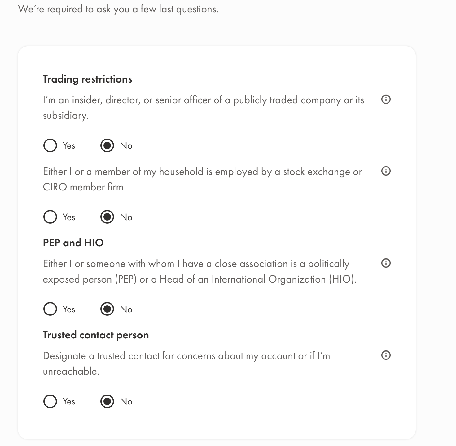 간단한 선호 사항입니다. 불리고 싶은 이름이 있는지, 성별, 결혼 상태를 기재하면 됩니다. 그리고 나면 자신이 속해 있는 소속에 대한 질문이 나오는데 트레이딩 할 때 제한이 있는 직업들이 있는 것 같습니다.
