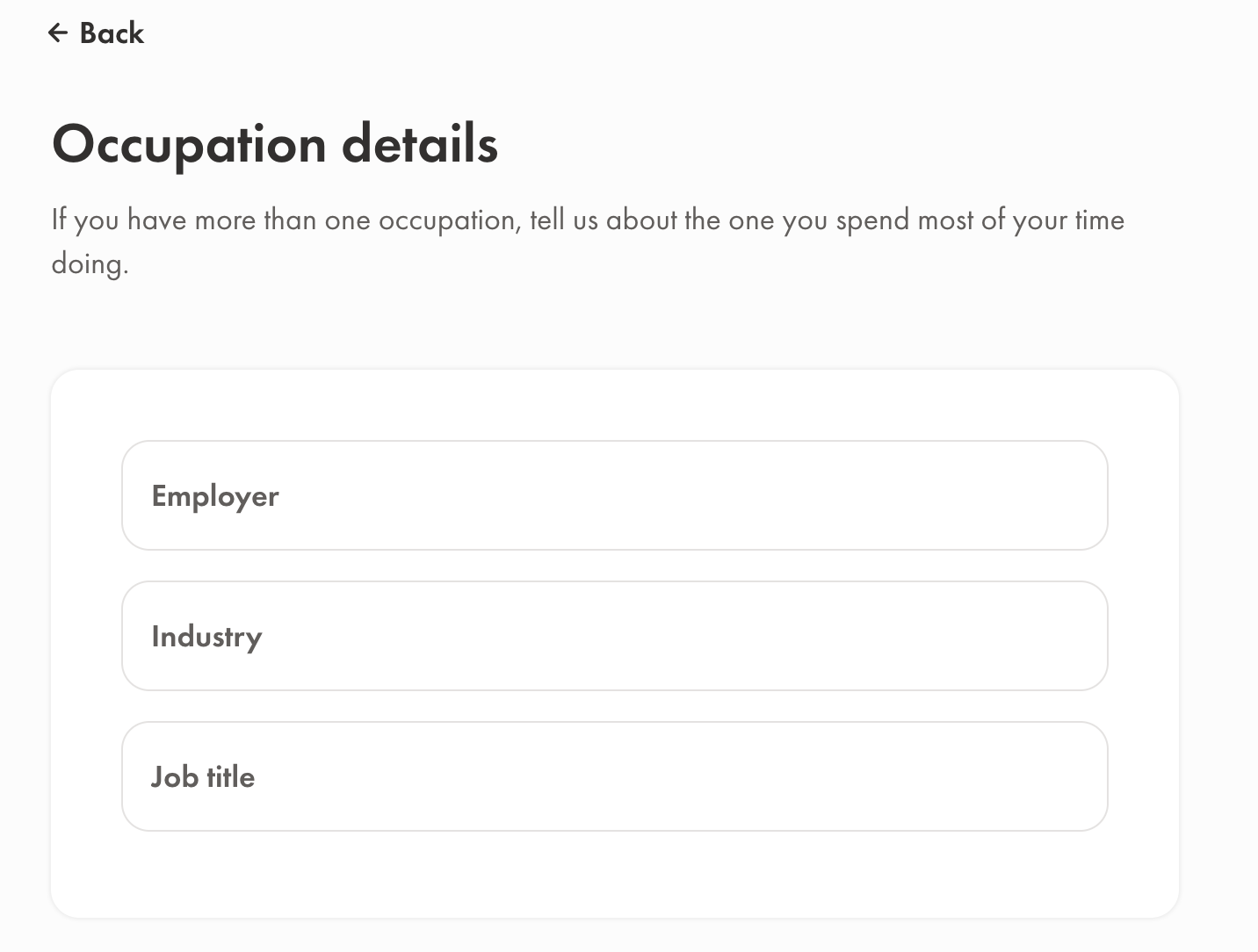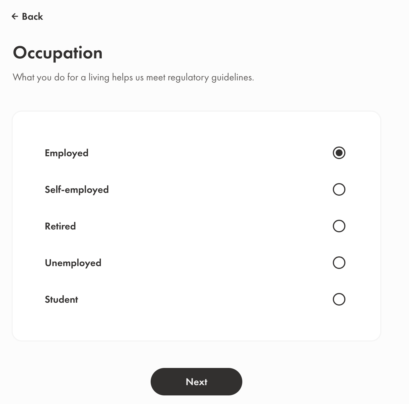 그 다음단계로 직업을 입력합니다. 고용/은퇴/학생 등 현재 상태를 입력하고 고용된 상태라고 하면 회사, 분약, 직책에 대해 입력하는 페이지로 이어집니다.
