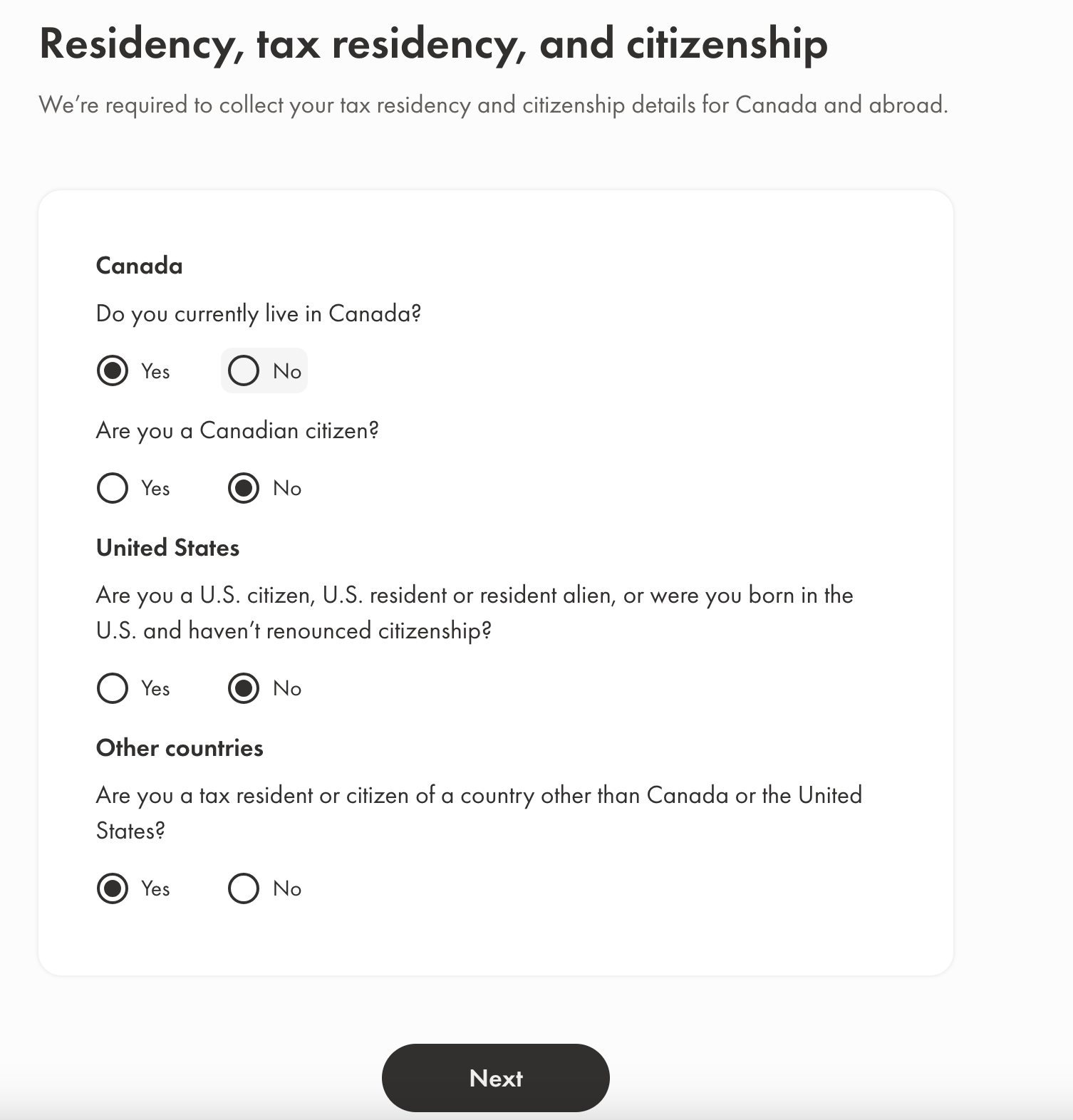 순서대로 현재 캐나다에 살고 있는지, 캐나다 시민인지를 묻습니다. 그 다음 미국 시민이거나 미국에서 태어났는지, 캐나다와 미국 이외의 나라의 시민이거나 세금 의무자인지 묻습니다. 저는 현재 한국 시민이여서 마지막 질문에 Yes로 응답하였습니다.