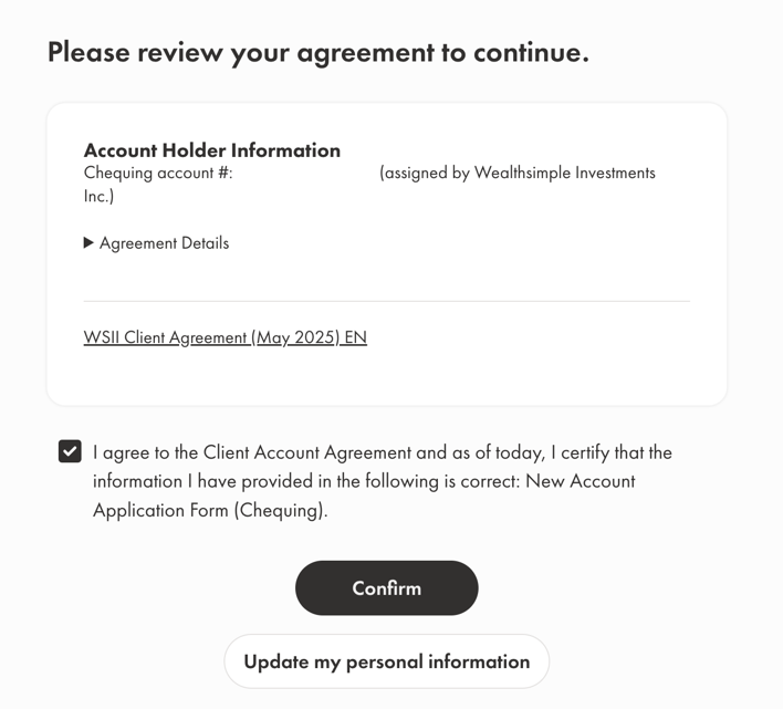 기본 정보 및 직업, 세금 정보는 이미 TFSA를 하면서 입력해서 바로 약관 동의 페이지로 연결되었습니다.