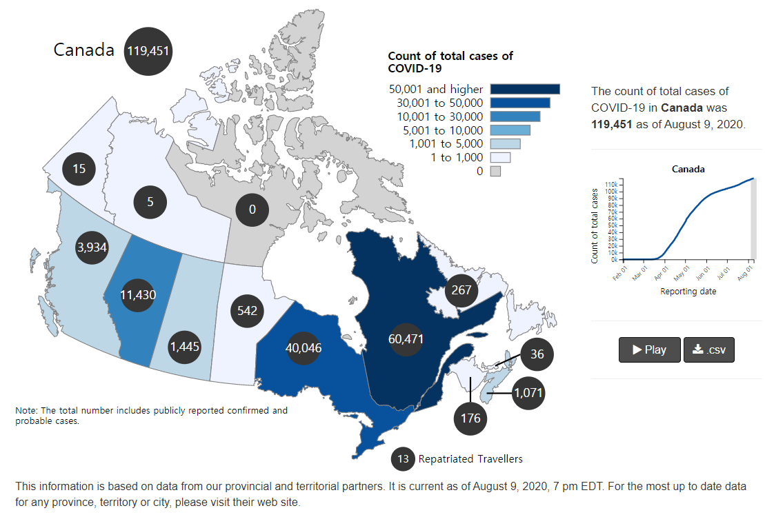 코로나 19 관련 캐나다 정부 홈페이지를 보면, 최근 감염자 증가율이 조금 꺾이기는 했지만 적지 않은 사람이 병에 걸리고 있다는 것을 알 수 있습니다. 특히 제가 가려고 하는 온타리오주의 감염자수가 퀘벡 다음으로 높네요.