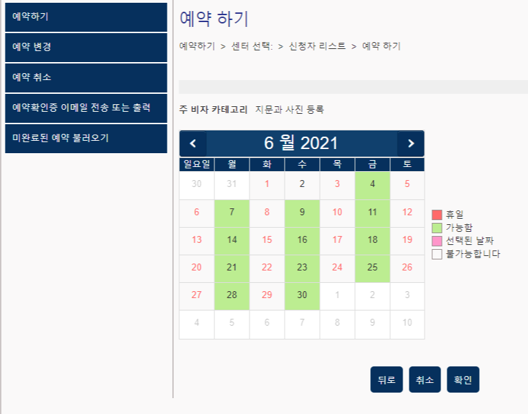 왼쪽 메뉴에서 "예약하기"를 누르고 자신에게 맞는 신청자수를 입력합니다. 한국에서 바이오메트릭스를 할 수 있는 곳은 서울 단 한 곳뿐이며, 4호선 회현역 근처입니다. 비자 카테고리도 "지문과 사진 등록"만 있어서 바로 선택하시면 됩니다.