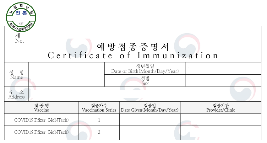 자가 격리 면제 받기 위해서는 코로나19 백신 영문 접종 증명서를 ArriveCAN에 등록해야 합니다. 이 증명서는 질병관리청 예방접종 도우미에서 발급받을 수 있고, 아래와 같은 양식으로 나옵니다.
